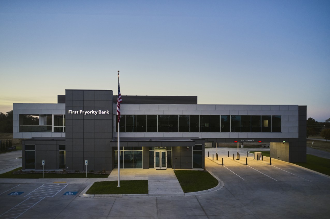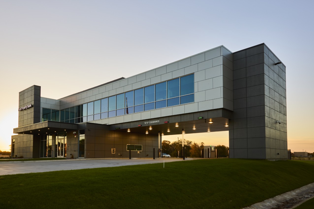 This 11,200-square-foot bank facility for First Pryority Bank is designed to fulfill the programmatic needs of our local client through a straightforward layout and contemporary design. The main entry welcomes visitors with expansive, light-filled spaces, featuring tall ceilings and maximized glazing for an inviting banking experience.