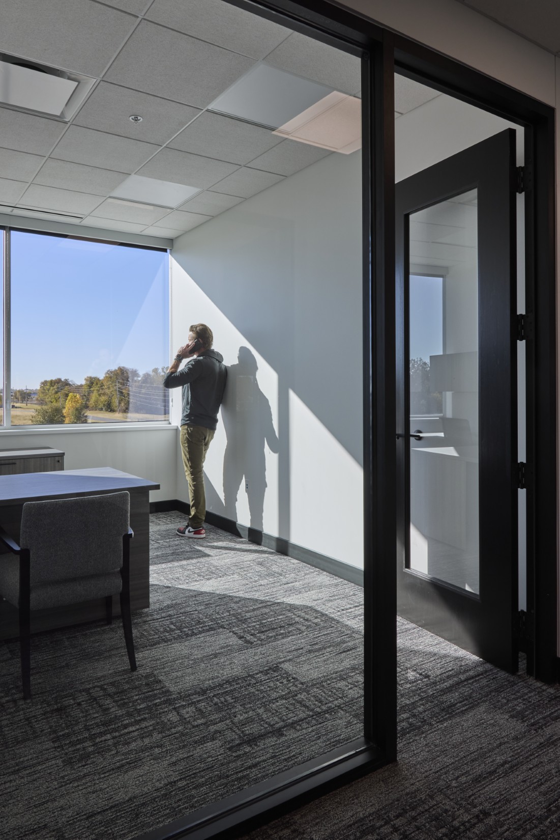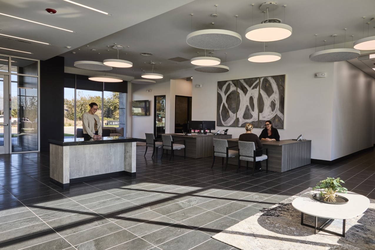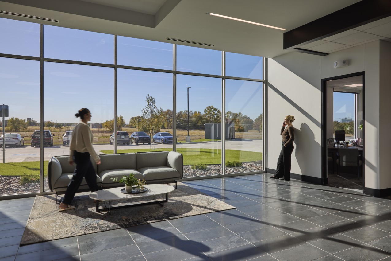 The facility also features a large drive-through banking area, a structural engineering feat, providing convenience and efficiency for customers who prefer to conduct their transactions from their vehicles. And the upper level includes support offices, meeting spaces, and a breakroom that opens onto an exterior open-air terrace, offering a blend of functionality and relaxation, and separating public and private spaces for the staff and customers. Both the exterior and interior designs showcase modern materials and meticulous detailing, ensuring a sleek and professional appearance.